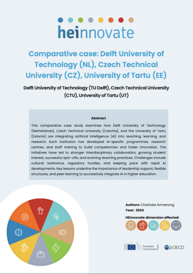 This comparative case study examines how Delft University of Technology (Netherlands), Czech Technical University (Czechia), and the University of Tartu (Estonia) are integrating artificial intelligence (AI) into teaching, learning, and research. Each institution has developed AI-specific programmes, research centres, and staff training to build competencies and foster innovation. The initiatives have led to stronger interdisciplinary collaboration, growing student interest, successful spin-offs, and evolving teaching practices. Challenges include cultural resistance, regulatory hurdles, and keeping pace with rapid AI developments. Key lessons underline the importance of leadership support, flexible structures, and peer learning to successfully integrate AI in higher education.