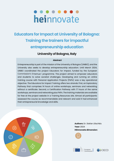 Entrepreneurship is part of the mission of the University of Bologna (UNIBO), and the University also seeks to develop entrepreneurship education. Until March 2024, UNIBO coordinated the project Educators for Impact, funded by the European Commission’s Erasmus+ programme. The project aimed to empower educators and students to solve societal challenges. Developing and running an online training course with Personal Application Projects (PAPs) was a key operational objective. The Educators for Impact Training offers two strands: First, an Exploratory Pathway that comprises 14 hours of online workshops, seminars and networking without a certificate. Second, a Certification Pathway with 17 hours of the same workshops, seminars and networking plus PAPs. The training materials are available for free at the project website in a Training Resources site. Almost all participants assessed the course as recommendable and relevant and said it had enhanced their entrepreneurial knowledge and skills.