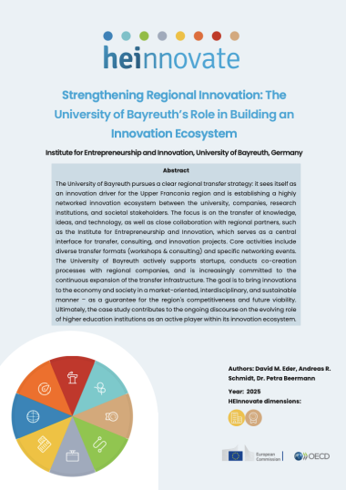 The University of Bayreuth pursues a clear regional transfer strategy: it sees itself as an innovation driver for the Upper Franconia region and is establishing a highly networked innovation ecosystem between the university, companies, research institutions, and societal stakeholders. The focus is on the transfer of knowledge, ideas, and technology, as well as close collaboration with regional partners, such as the Institute for Entrepreneurship and Innovation, which serves as a central interface for transfer, consulting, and innovation projects. Core activities include diverse transfer formats (workshops & consulting) and specific networking events. The University of Bayreuth actively supports startups, conducts co-creation processes with regional companies, and is increasingly committed to the continuous expansion of the transfer infrastructure. The goal is to bring innovations to the economy and society in a market-oriented, interdisciplinary, and sustainable manner – as a guarantee for the region's competitiveness and future viability. Ultimately, the case study contributes to the ongoing discourse on the evolving role of higher education institutions as an active player within its innovation ecosystem.